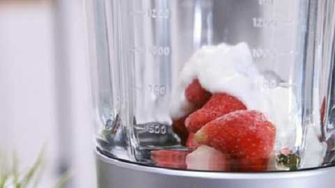 | Cho 200g đá lạnh, dâu tây đã đông lạnh, mật ong và sữa chua vào máy xay sinh tố xay cho đến mịn rồi rót ra cốc. |