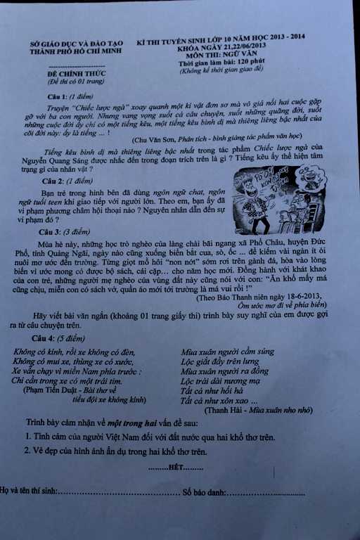 | Đề thi chính thức môn Ngữ văn lớp 10 TP.HCM |