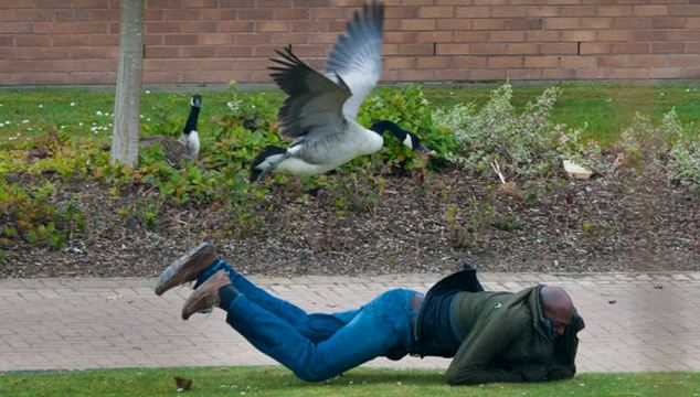 Chàng trai buộc phải nằm xuống để tránh cú đạp của ngỗng mẹ ở Đại học Warwick, Anh
