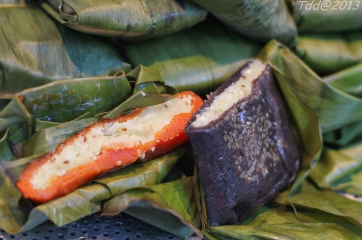 Xé lớp lá chuối khô bao bọc bên ngoài, bất cứ ai cũng bị ấn tượng ngay với hương thơm dịu nhẹ của bột nếp được hòa trộn với gấc. Bánh dẻo, dính nhưng mềm và không nhão, khi nhai lại không bị giắt răng nên trẻ em hay người già đều thích. Ăn đến phần nhân bánh, thực khách còn ấn tượng hơn với vị béo, bùi, ngọt của hạt sen, mứt bí, đỗ xanh, dừa nạo, thoang thoảng hương thơm của dầu chuối.
