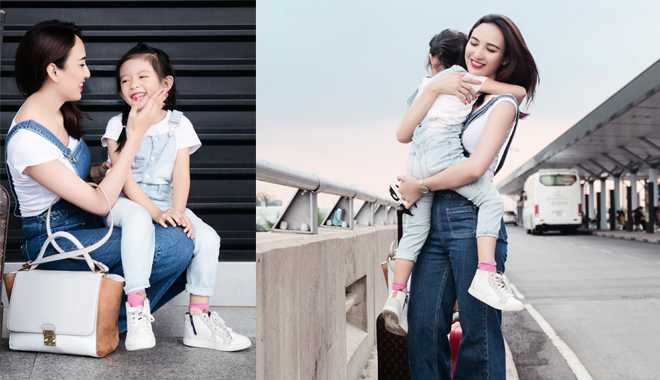 | Hai mẹ con Ngọc Diễm vốn ưa thích việc mặc đồ đôi, nên khi xuất hiện tại sân bay hôm qua với hai bộ đồ yếm, mẹ con hoa hậu đã thu hút sự chú ý của nhiều người. Bên cạnh con gái, "bà mẹ một con" dường như rất thoải mái vui đùa với con. |