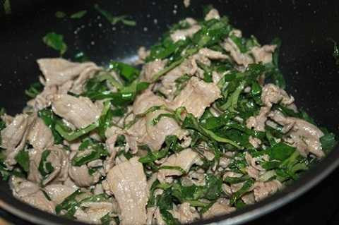 | Thịt bỏ vừa tái thì cho lá lốt vào, đảo đều. Lá lốt vừa chín thì bắc chảo ra khỏi bếp. |