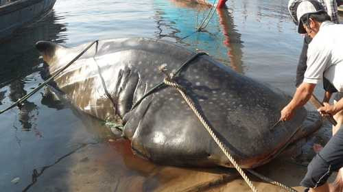 Hơn 20 ngư dân khỏe mạnh không thể đưa được cá vào bờ đành phải nhờ xe tải móc dây vào mới kéo được cá lên bờ.