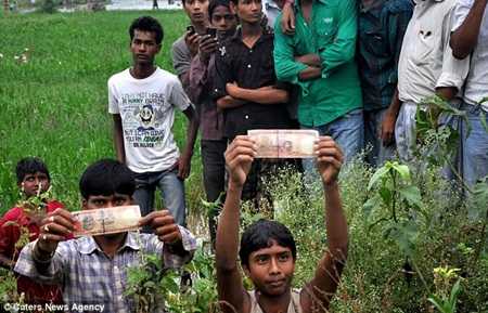 | Những người dân giơ cao những đồng 500 và 1.000 rupee (tiền tệ của Ấn Độ) mà họ nhặt được trên mặt nước |