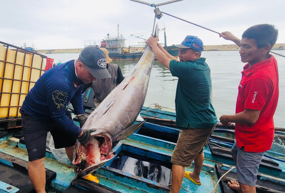 Ông Lộc và các thuyền viên rất phấn khởi khi chuyến biển này thu về gần 30 con cá ngừ đại dương trọng lượng từ 40kg trở lên, đặc biệt có một con cá ngừ mắt to quý hiếm nặng gần 100kg.