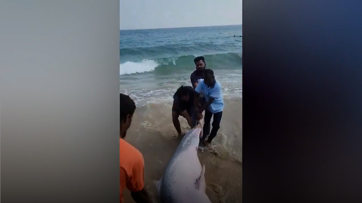 Những ngư dân ở Tamil Nadu, Ấn Độ cùng hợp sức đưa 3 con cá heo bị mắc cạn ra vùng nước sâu.