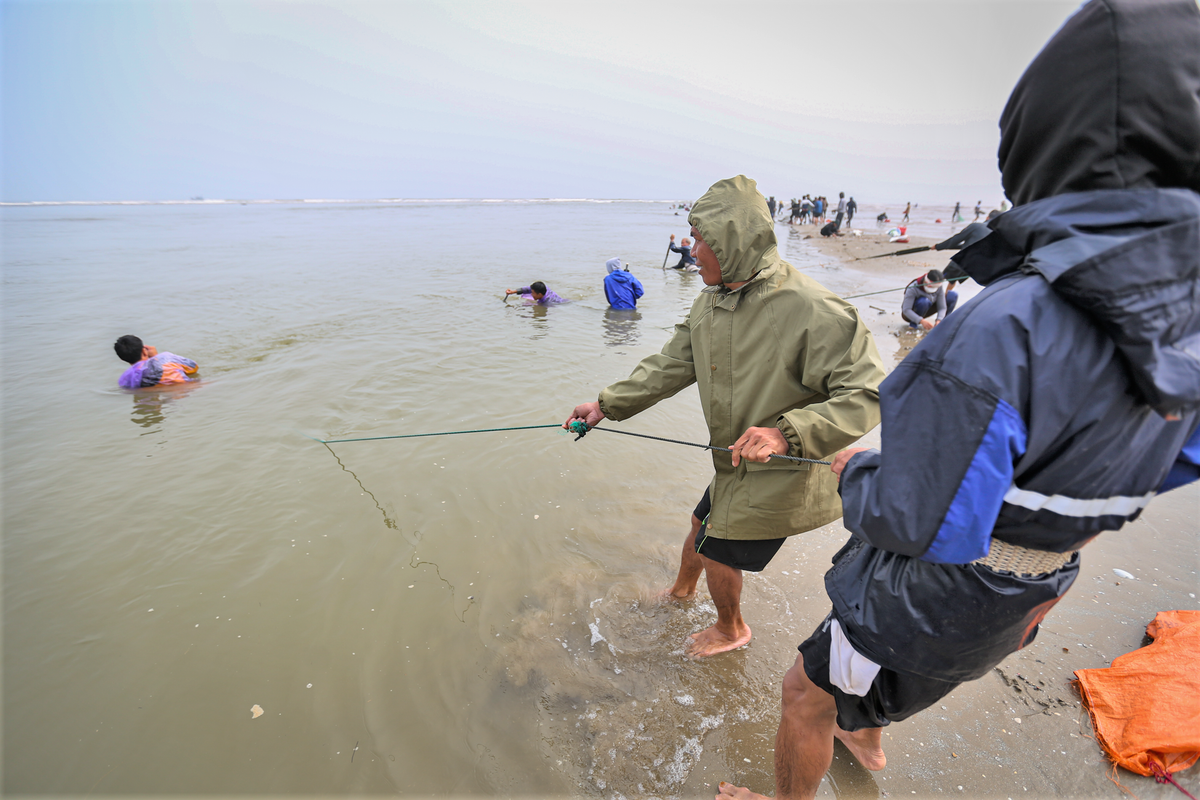 “Cần câu” của họ là vợt sắt dài 1,5 m, gắn lưới dài khoảng 2 m. Sau đó, ngư dân đi ra ngoài vùng biển sâu 60-80 cm ngụp lặn xúc sò.