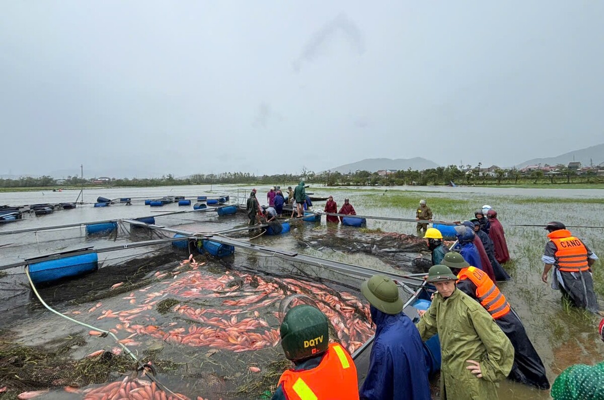 Đội cơn mưa nặng hạt, người dân trong xã chung tay giúp chủ hộ nuôi cá lồng bè thu gom số cá có thể đưa đi tiêu thụ hòng vớt vát được chừng nào hay chừng đó.