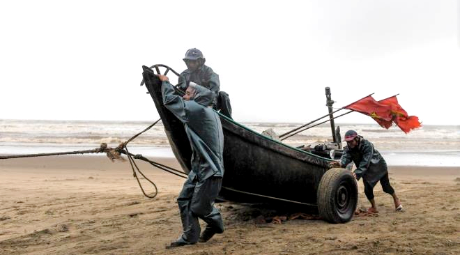 Đến 9h, hầu hết thuyền đánh cá đã được kéo lên đường. Gió ở khu vực ven biển thành phố Sầm Sơn mỗi lúc một mạnh.
