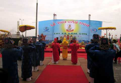 | Nghi thức tế lễ trang nghiêm khai mạc lễ hội Cầu ngư - Bơi chải 2014 của các cao niên thị xã Sầm Sơn. |