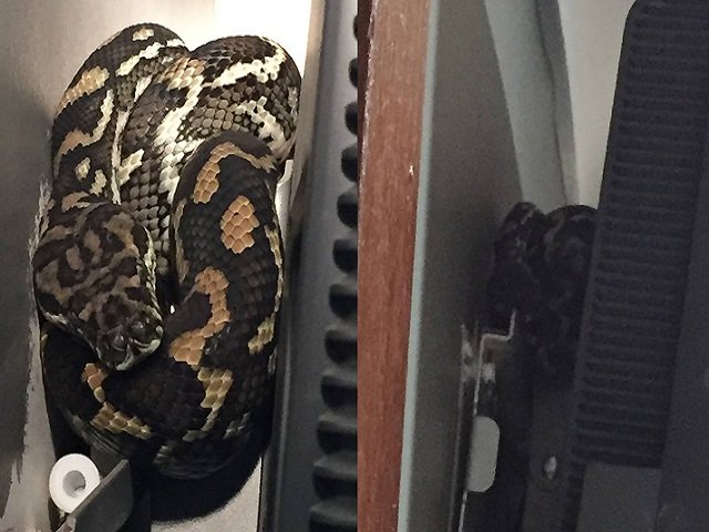 "Con trăn thảm liều lĩnh này đã quyết định đánh thức chủ nhân căn nhà ở Brisbane vào lúc 2 giờ sáng bằng cách làm đổ chai rượu ở quầy bar. Sau đó, nó đi tìm một điểm ấm áp hơn đằng sau ti vi", những người bắt rắn nói.