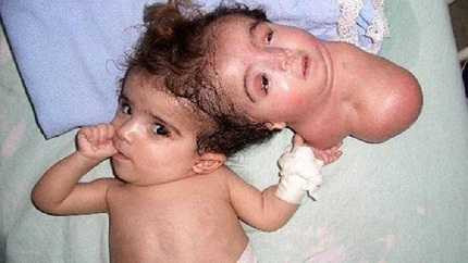 Em bé 2 đầu người Indonesia được sinh bằng phương pháp mổ đẻ tại 1 bệnh viện của tỉnh Riau, vào ngày 23/7/2009. Khi ra đời em nặng 3,2 kg và dài 43cm. Các bác sĩ cho hay, bé trai này thực chất là 1 cặp song sinh dính liền phần thân nhưng không thể tách rời ra được. Em bé này chỉ sống được có 5 ngày.