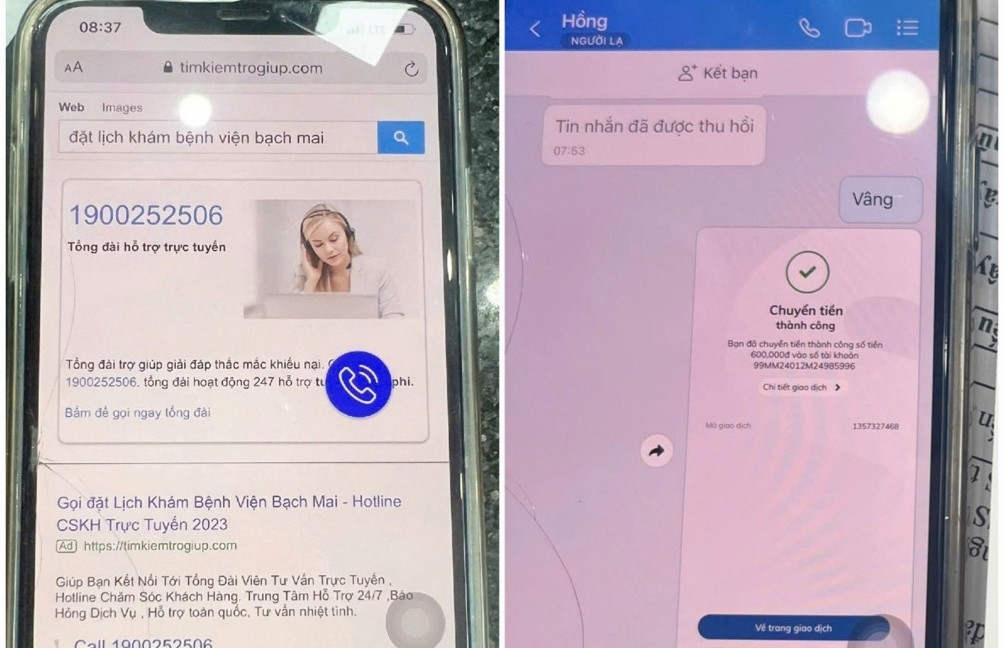 Chị gọi theo số này nói chuyện với "tổng đài viên" và nhu cầu muốn đặt lịch khám cho con tại Bệnh viện Bạch Mai, được hướng dẫn "có nhân viên kết bạn Zalo gửi tin nhắn xác nhận". Tiếp đó, chị nhận được mã QR code số tài khoản yêu cầu chuyển khoản tiền đặt lịch khám là 600.000 đồng.