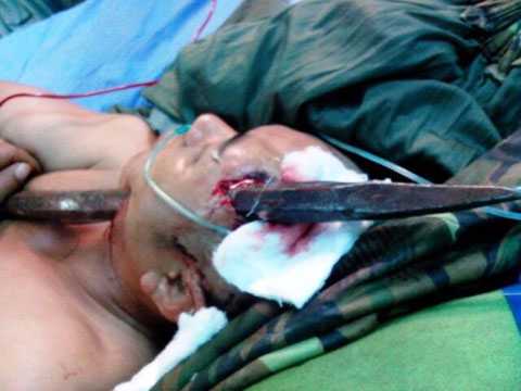 13/11/2013 02:55:00 +07:00Khi đang đào đất, anh Phạm Văn Tú bị trượt chân khiến xà beng đâm xuyên từ dưới quai hàm lên thái dương.