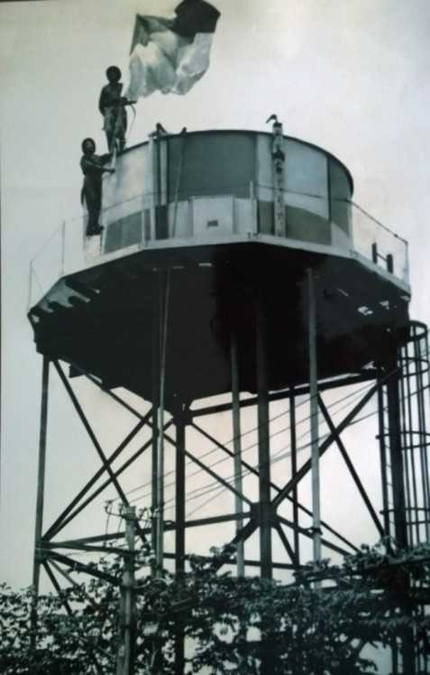 Nói xong, anh Mười Tài đưa ra 3 lá cờ lớn và cử 6 người làm nhiệm vụ. Tôi cùng anh Phạm Văn Lãi - chiến sĩ đội chiếu phim, được phân thành cặp đi cắm cờ. Biết gần cổng chính có tháp nước cao tầm 20 m, tôi cùng anh Lãi cầm cờ chạy nhanh đến đó".