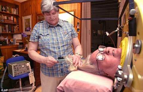 Với chiếc 'phổi' này, bà Martha không cần phải nằm ở viện nữa, song luôn có hai phụ tá trợ giúp.
