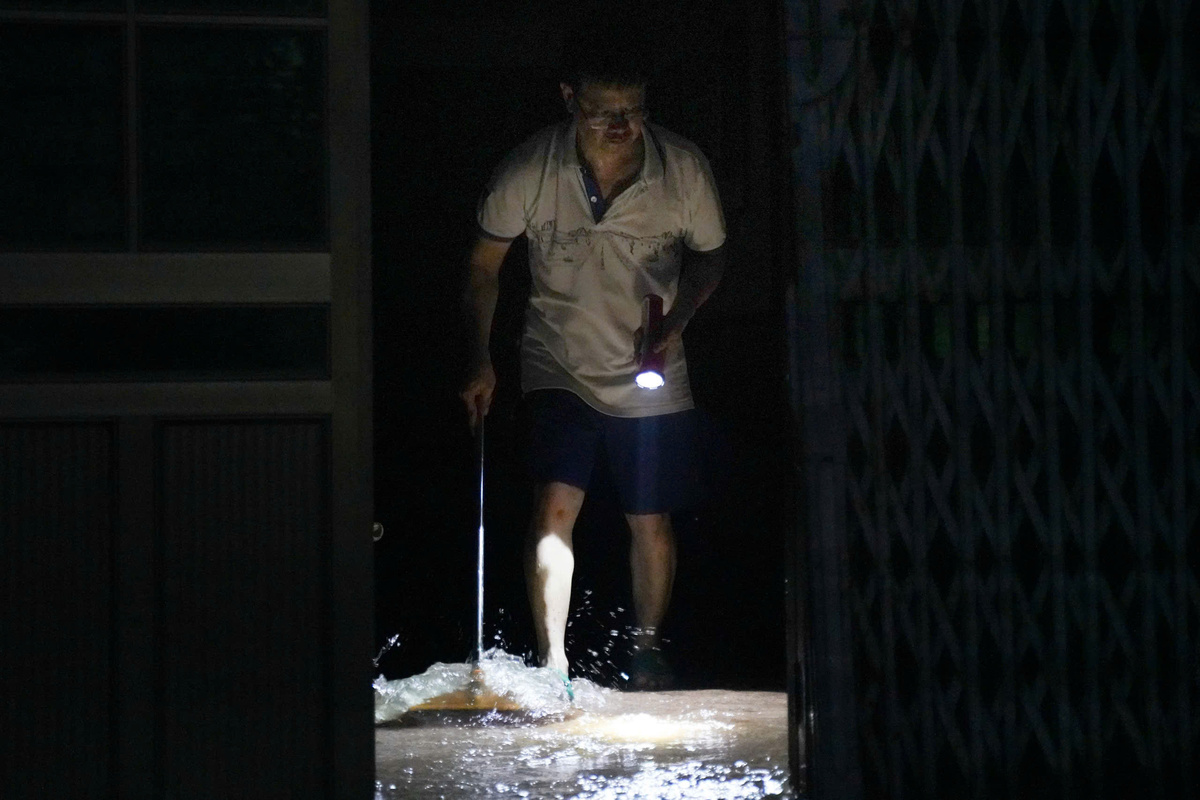 Khuya 12/10, khi nước lũ trên sông Thương bắt đầu rút, nhiều hộ dân ở phường Đa Mai (TP Bắc Ninh) trở về nhà. Cả khu vực vẫn bị cắt điện, chìm trong màu đen đặc quánh. Người dân dò dẫm từng bước trong bùn, chỉ dựa vào ánh đèn pin le lói để trở về nhà sau lũ.