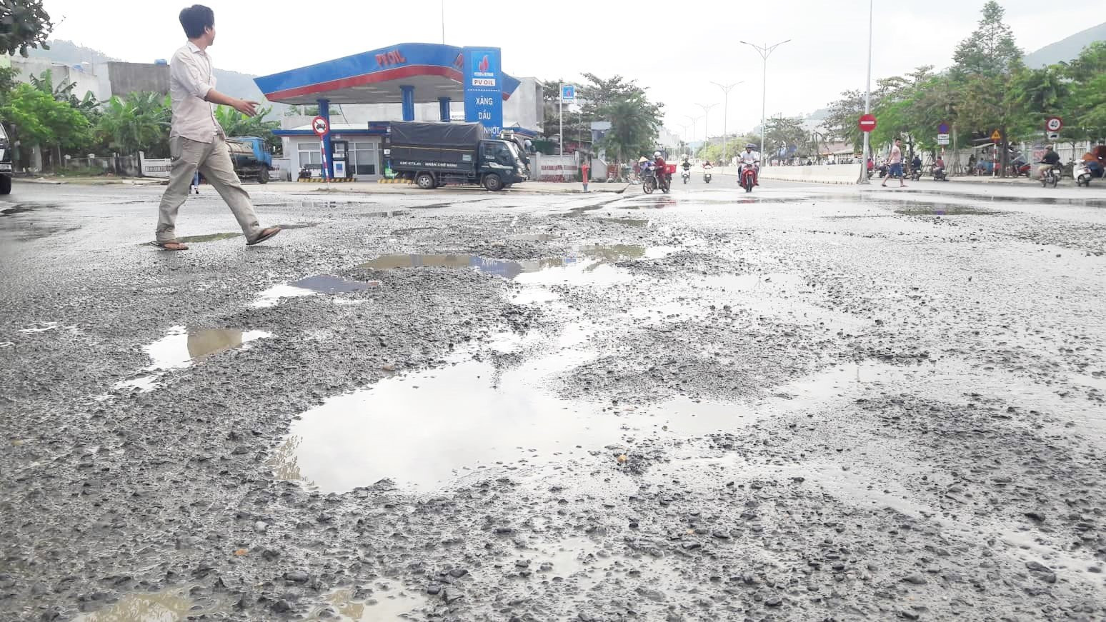 Hàng trăm xe tải chạy suốt ngày đêm khiến mặt đường Hoàng Văn Thái hư hỏng nặng.