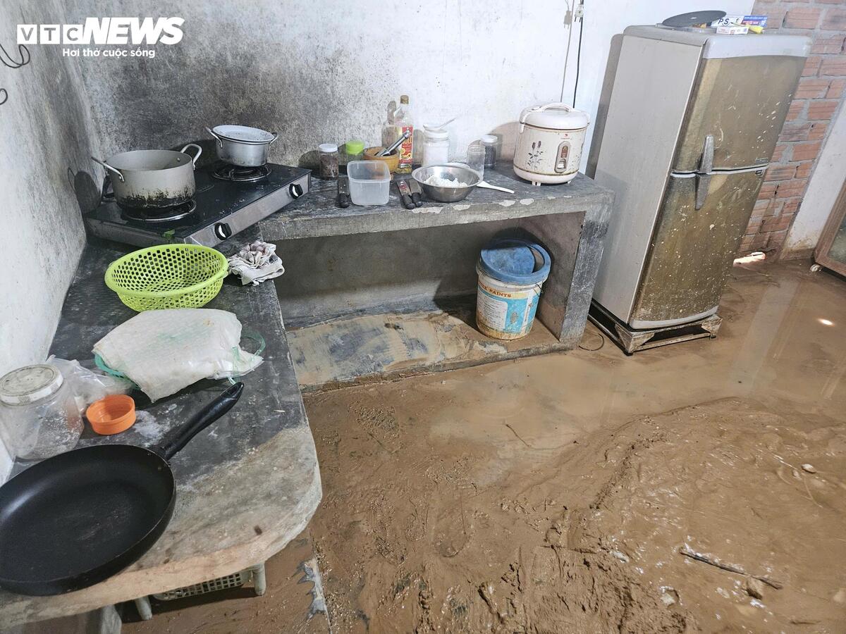 Sau trận mưa ngày 16/10 vừa qua, bùn đất tràn khắp nhà, vào cả gian bếp. "Tôi phải mua cơm hộp cho 2 cha con ăn qua ngày và đưa con đến nhà hàng xóm trú ẩn chứ thật sự không ở được. Nhiều lần kiến nghị lên cơ quan chức năng để di dời, đảm bảo an toàn cho gia đình như chưa được giải quyết" - anh Cường kể.
