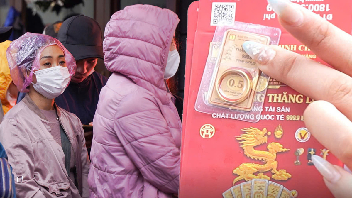 Dù trời mưa phùn, hàng trăm người dân Hà Nội vẫn đội mưa xếp hàng dài, chờ mua vàng trước ngày vía Thần Tài.