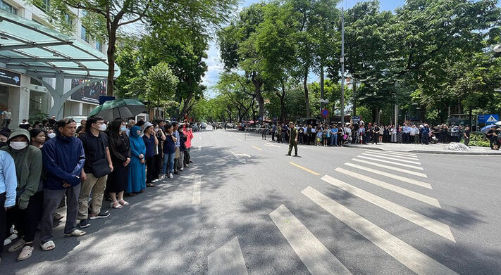 Trước giờ diễn ra lễ truy điệu Tổng Bí thư Nguyễn Phú Trọng, rất đông người dân đứng kín vỉa hè phố Tràng Tiền để tiễn đưa Tổng Bí thư Nguyễn Phú Trọng về nơi an nghỉ cuối cùng.