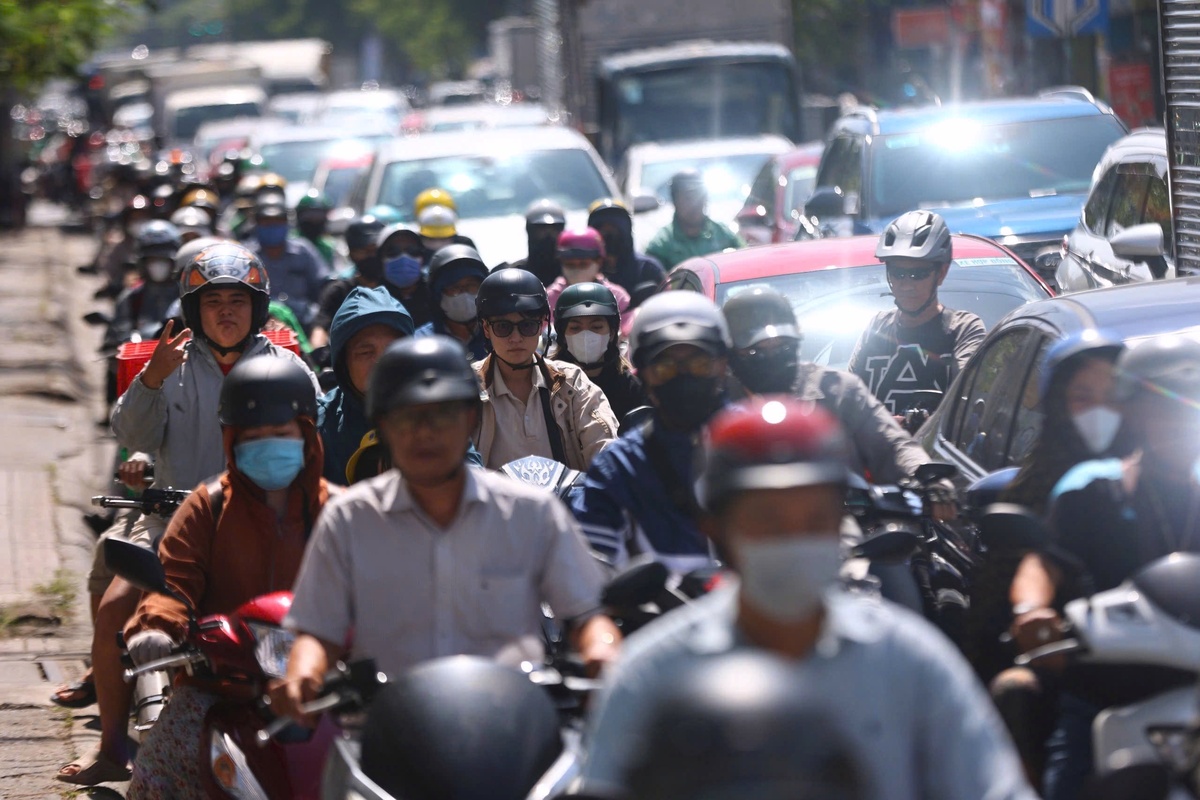 Dòng người nhích từng chút một trên đường Nguyễn Tất Thành.
