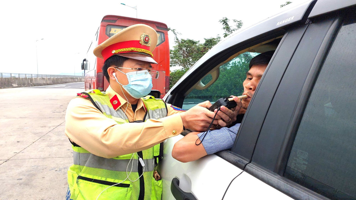 Lực lượng CSGT (Bộ Công an) kiểm tra nồng độ cồn tài xế trên cao tốc Đà Nẵng - Quảng Ngãi.