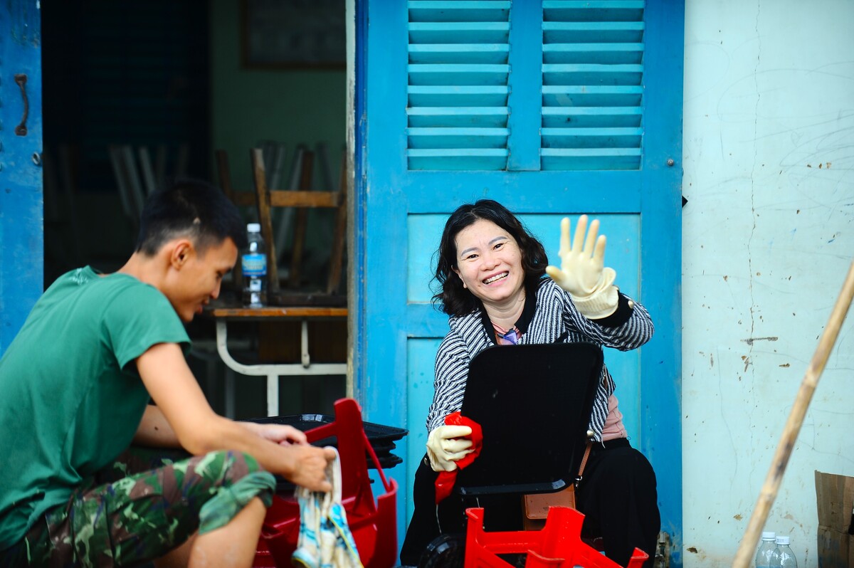 Bà Trương Minh Trân cho biết sau khi có lực lượng quân đội đến hỗ trợ, công việc lau dọn bàn ghế, đồ đạc ngập trong bùn tại cơ sở 2 Trường Tiểu học Vĩnh Hiệp, phường Tây Nha Trang cũng trở nên nhẹ nhàng cho nhà trường.