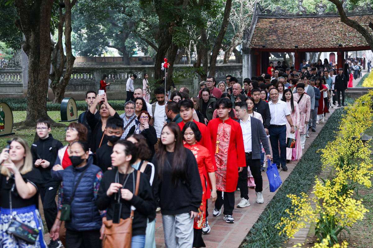 Chiều mùng 1 Tết Bính Ngọ 2026, Văn Miếu – Quốc Tử Giám đón nhiều gia đình đưa con em tới du xuân, vãn cảnh. Dịp đầu năm, đây là điểm đến quen thuộc của người dân Thủ đô.