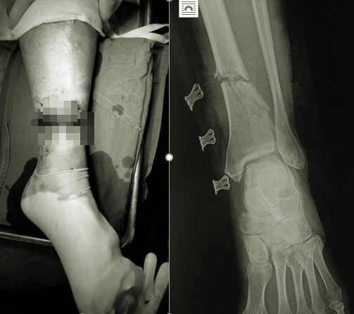 Thông tin về ca bệnh, BS Hoàng Minh Thắng - Khoa Phẫu thuật Chi trên và Y học thể thao cho biết, ngay sau khi tiếp nhận, bệnh nhân được xử lý cố định ngoài xương chày, nối gân, thần kinh, nối động mạch chày trước, chày sau.