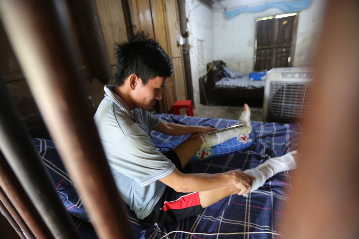 Anh Kiên nằm một chỗ sau khi đôi chân bị máy cắt tàn phá. Bác sĩ nói cần rất nhiều tiền để có thể đi lại bình thường. (Ảnh: Trọng Tùng)