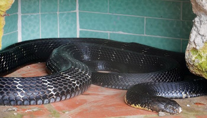 Khoảng 21h30 ngày 21/9, ông Lê Xuân Hòa (60 tuổi, trú tại xóm 3, làng Lâm Hội, xã Châu Hội) nghe tiếng gà kêu phía sau bếp nên đi xuống để kiểm tra thì phát hiện một con rắn hổ mang chúa đen dài bên trong chuồng gà.