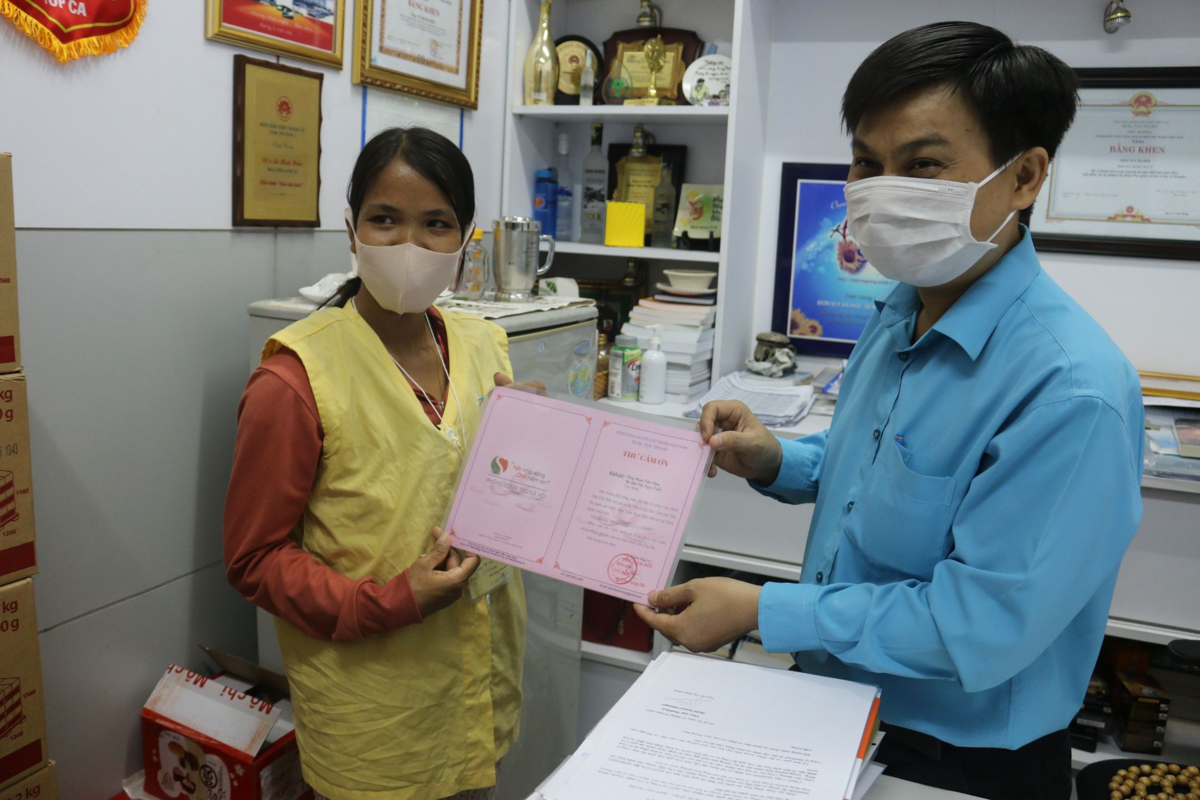 Chị Bùi Thị Ngọc Tuổi, vợ nạn nhân bị rắn hổ mang cắn nhận thư cảm ơn từ BV Chợ Rẫy.