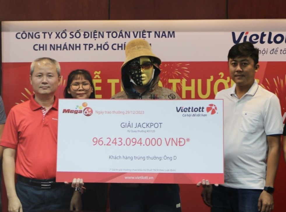 Trưa 29/12, đại diện Công ty Xổ số điện toán Việt Nam (Vietlott) - Bộ Tài chính đã trao giải Jackpot của sản phẩm Mega 6/45 kỳ quay 1.125 trị giá hơn 96 tỷ đồng cho ông D.