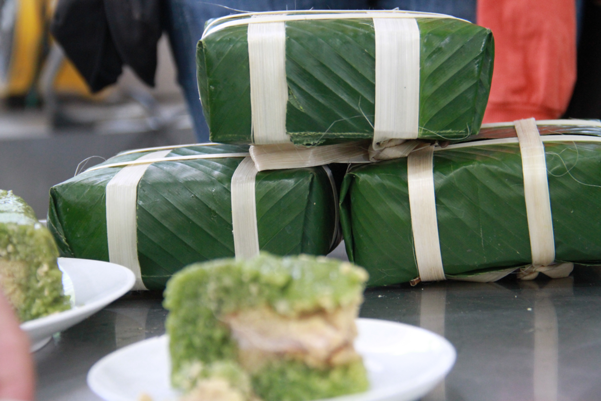 Gạo nếp được trộn đều với nước ép lá riềng để cho ra màu xanh đẹp mắt.