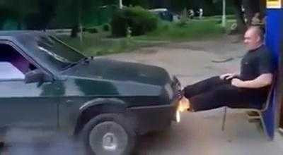 (VTC News) - Người đàn ông ngồi trên ghế dùng hai chân cản chiếc ô tô tiến lên, sau một hồi đọ sức, hai bánh ô tô bốc khói mù mịt.