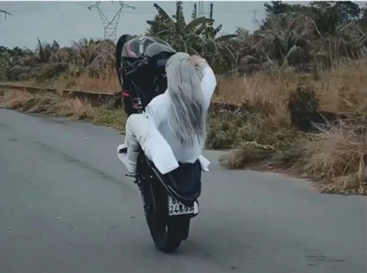 Đoạn clip ghi lại cảnh người đàn ông mặc áo trắng, quần trắng, tóc trắng, chạy xe máy biển số tỉnh Bình Dương bằng chân. Tiếp đó, người này còn thực hiện động tác "bốc đầu" xe máy bằng 1 tay, di chuyển bằng bánh sau trên đoạn đường dài.