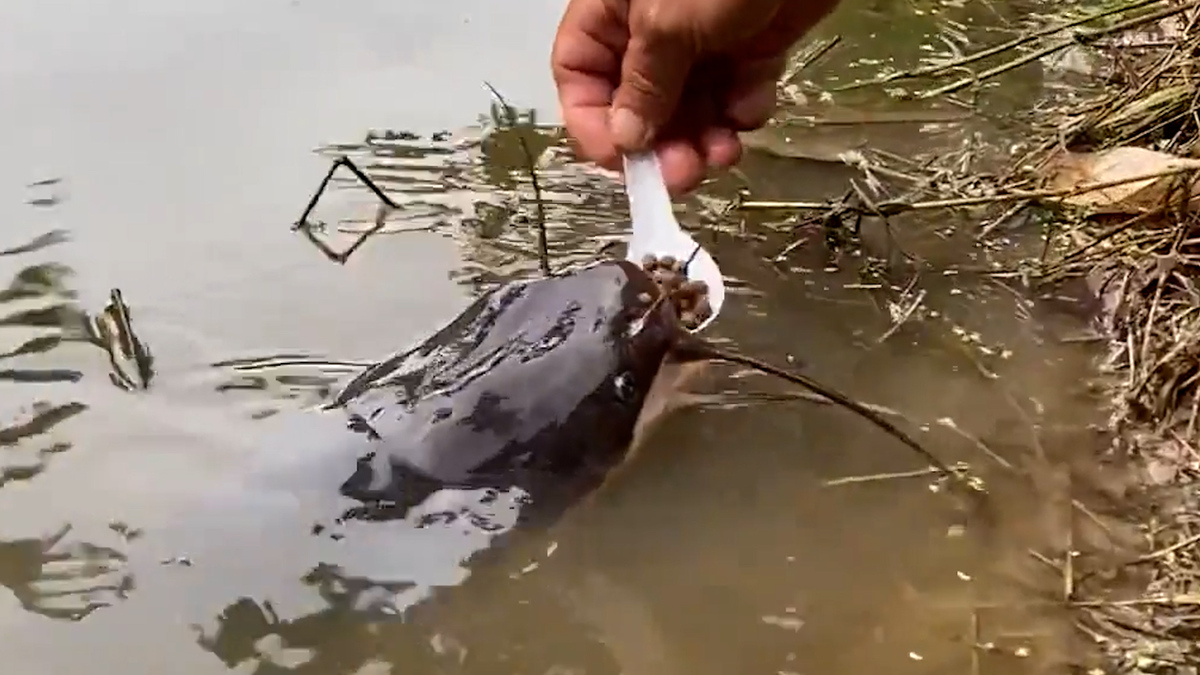 Người đàn ông ở Thái Lan đã làm bạn với một con cá chê, anh ta thoải mái vuốt ve nó và cho nó ăn bằng thìa.