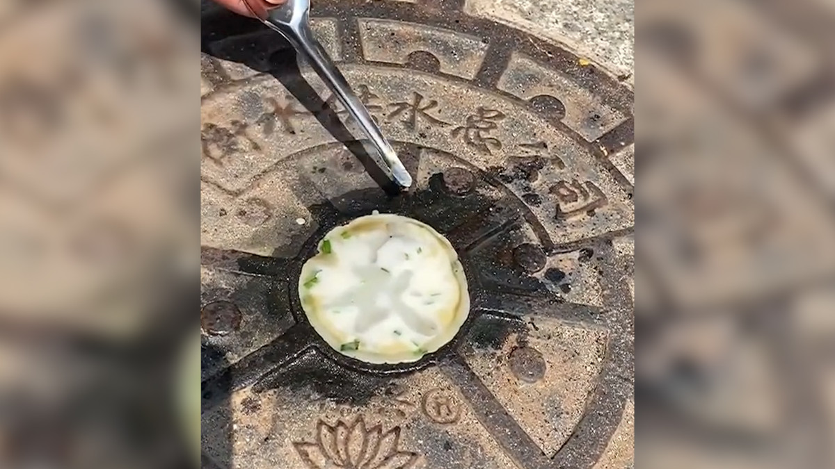 Người đàn ông nướng bánh trên nắp cống giữa nắng nóng như thiêu đốt
