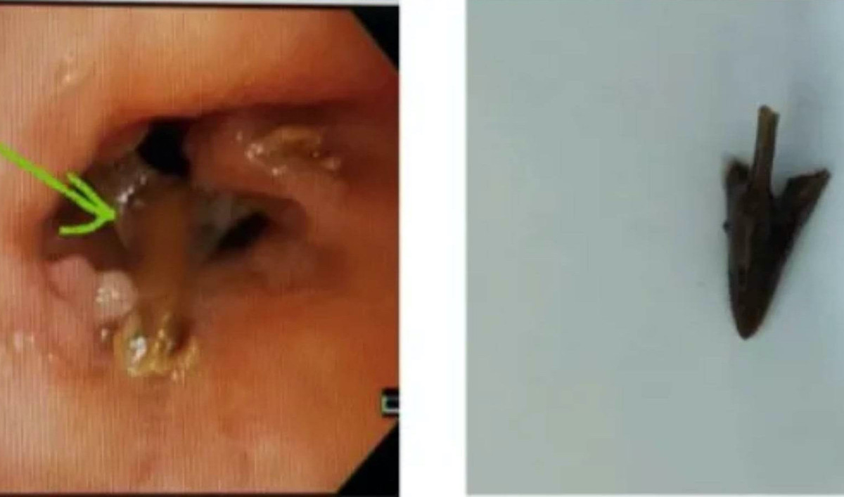 Mũi tên đỏ thể hiện vị trí dị vật và "thủ phạm" được lấy ra khỏi phế quản bệnh nhân. (Ảnh: BVCC)