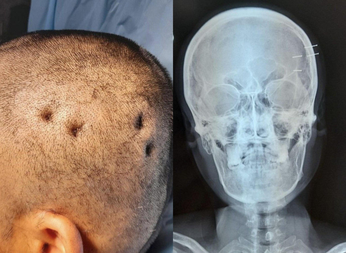 Sau khi xét nghiệm, các bác sĩ đã phẫu thuật gắp bốn cây đinh ra khỏi đầu ông H. Rất may những chiếc đinh này không vào não, bệnh nhân chỉ có dấu hiệu xuất huyết não nhẹ.
