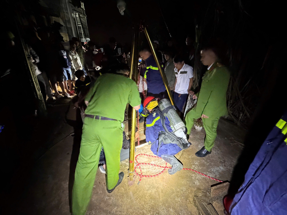 Cán bộ mang bình dưỡng khí xuống giếng cứu nạn nhân.