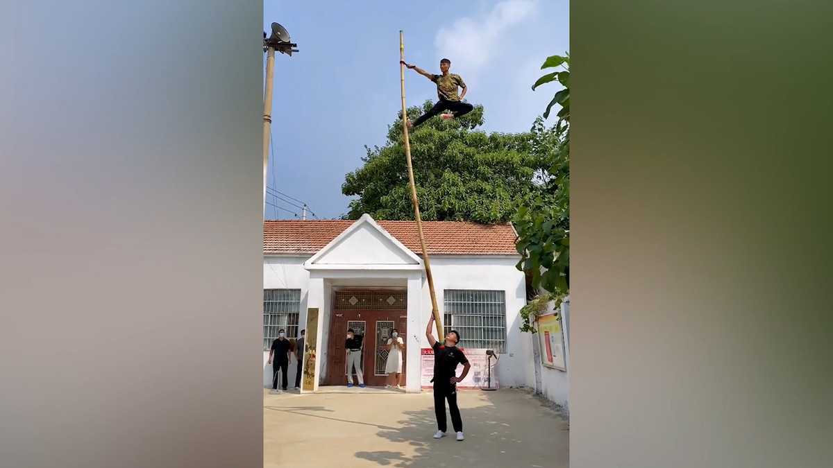 Người đàn ông trình diễn nhào lộn trên cây cột cao 6m ở Trung Quốc