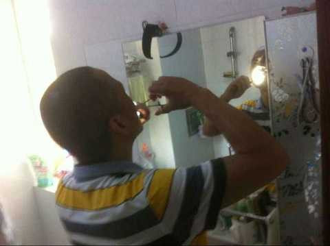 Phòng tắm chính là ‘phòng phẫu thuật’ của Yu. Trong quá trình ‘làm phẫu thuật’ anh tự soi đèn vào miệng để cắt bỏ từng miếng nhỏ của khối u đang phát triển.