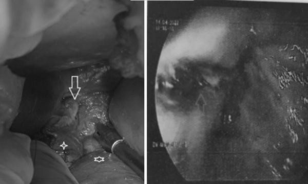 Hình ảnh thực quản trong nội soi dạ dày (bên phải) và lỗ thủng thực quản phát hiện khi phẫu thuật vùng bụng.