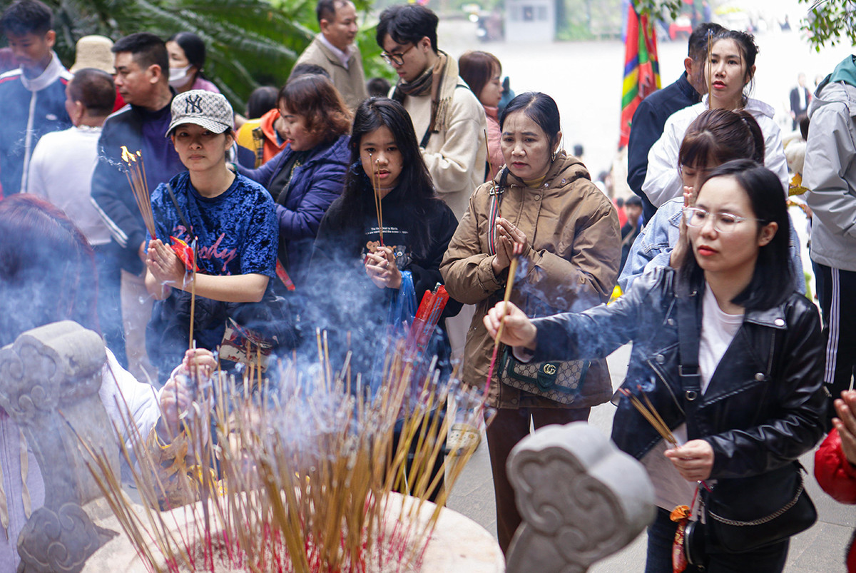 Do lượng người thắp hương quá đông, ban quản lý phải cử người rút bớt các nén hương ở lư hương.