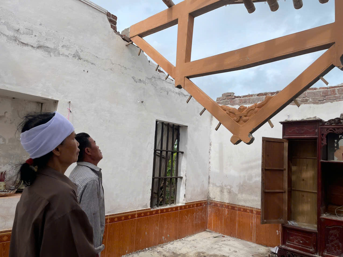 "Mái ngói bị bay mất toàn toàn. Lúc cơn lốc xoáy đến, tường gạch nứt toác phát rõ âm thanh, tôi cảm tưởng như mình mù lòa vậy, không nhìn thấy gì, bên tai chỉ còn tiếng gió và đổ vỡ. Tay chân run bần bật vì sợ bị tường đè hoặc bị gió cuốn chết bất cứ lúc nào", bà Thoa bần thần kể lại.