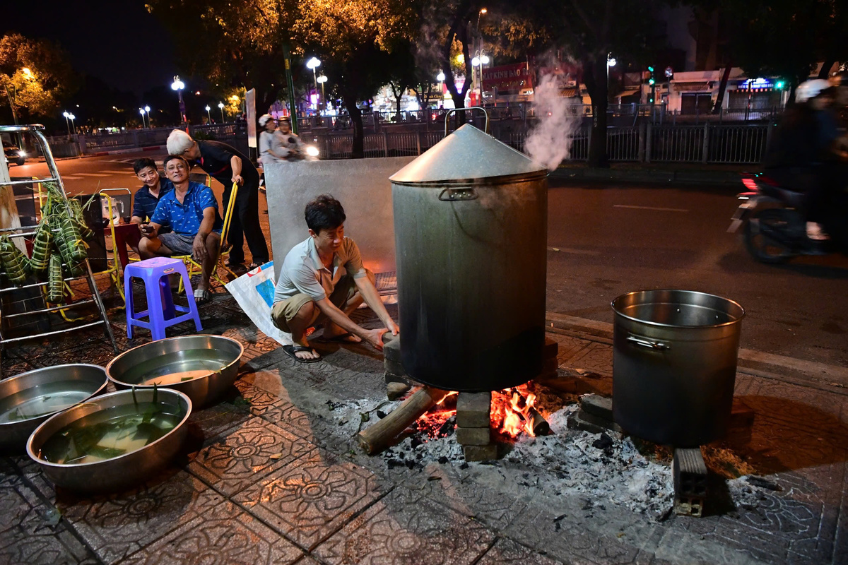 Tại phường Tân Sơn Nhất, gia đình ông Huỳnh Văn Phú quây quần bên nồi bánh từ đầu tối. Người châm thêm củi, người kiểm tra mực nước, người khác tranh thủ nghỉ ngơi nhưng vẫn thay nhau canh lửa xuyên đêm. Dù vất vả nhưng ai cũng háo hức bởi đây là khoảnh khắc sum họp hiếm hoi sau một năm bận rộn.