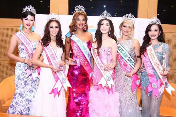 | Diệu Linh (phải) chụp hình cùng người đẹp các nước. |