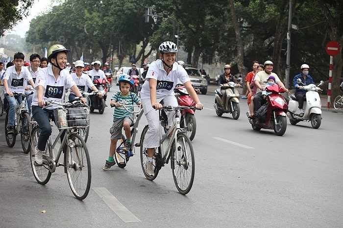 Nhóm đạp xe qua những địa điểm như Nhà Hát lớn - Tràng Tiền - Đinh Tiên Hoàng - Lê Thái Tổ - Tràng Thi - Điện Biên Phủ,... và dừng tại Vườn hoa Lê nin.